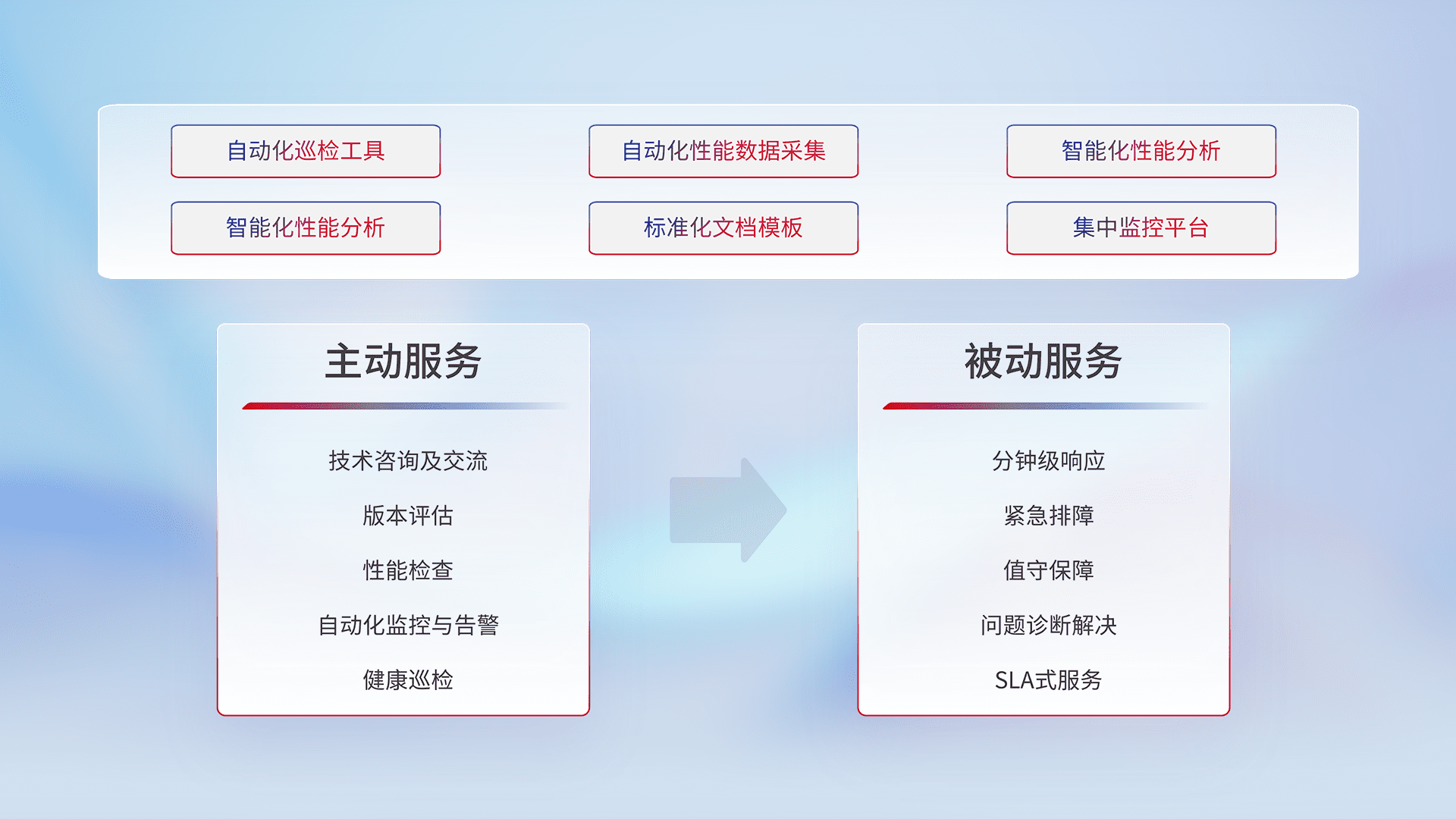 智能化工具和标准化文档,,保障服务质量,,,,提供主动服务(包含技术咨询、、、版本评估、、性能检查、、、、自动化监控与告警、、、健康巡检)和被动服务包含(分钟级响应、、、紧急排障、、、、值守保障、、、、问题诊断解决、、SLA服务)。。